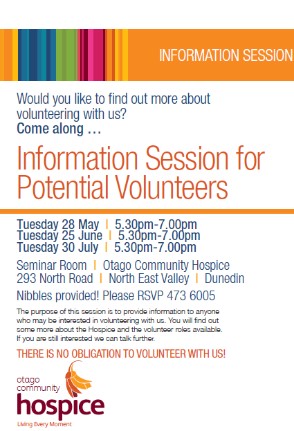 Information Session for Potential Volunteers Tuesday 28th March| 5:30pm-7:00pm Seminar Room | Otago Community Hospice 293 North Road | North East Valley | Dunedin Nibbles provided! Please RSVP 473 6005 The purpose of this session is to provide information to anyone who may be interested in volunteering with us. THERE IS NO OBLIGATION TO VOLUNTEER WITH US!