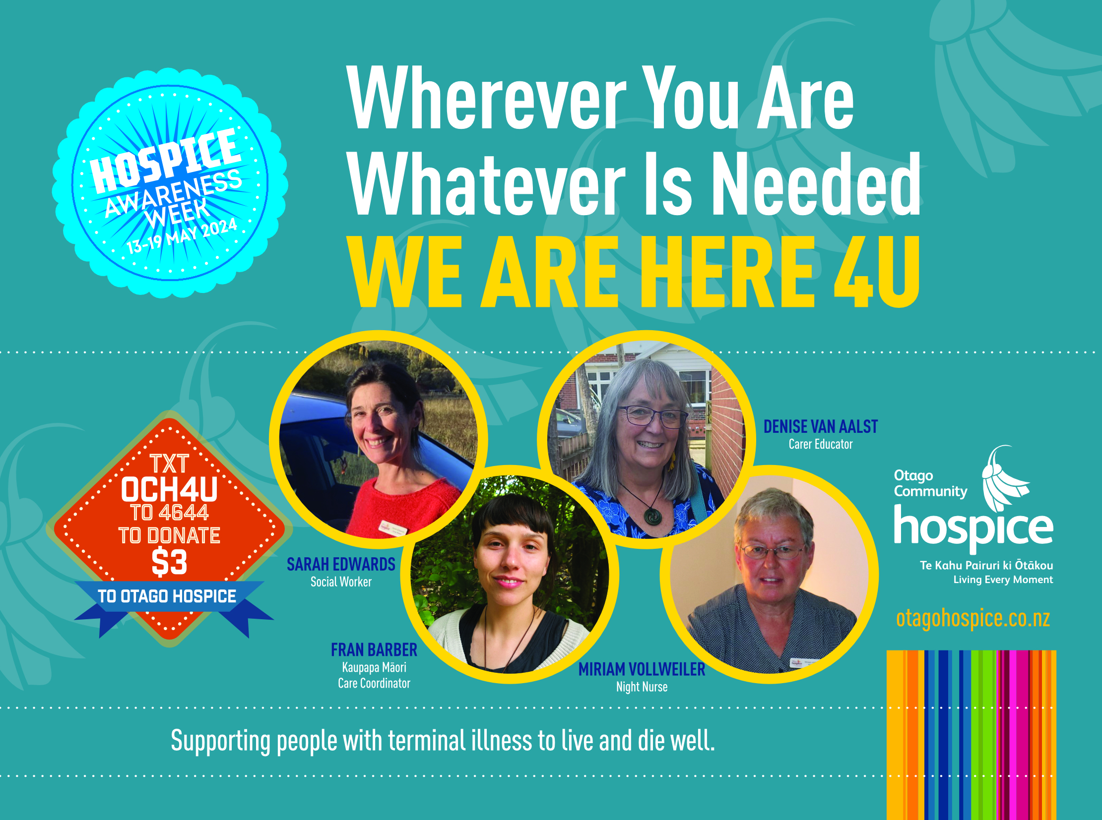 Four key roles are being spotlighted for Hospice Awareness Week this year. Fran Barber is a Kaupapa Māori Care Coordinator who supports Māori and Pasifika tūroro and whānau. Sarah Edwards is a Social Worker who visits patients in their homes across Central and North Otago. Denise van Aalst is a Carer Educator who provides up-to-date and valuable education to family carers, and Miriam Vollweiler is a Night Carer who relieves family carers overnight when their loved ones are in their last days of life.