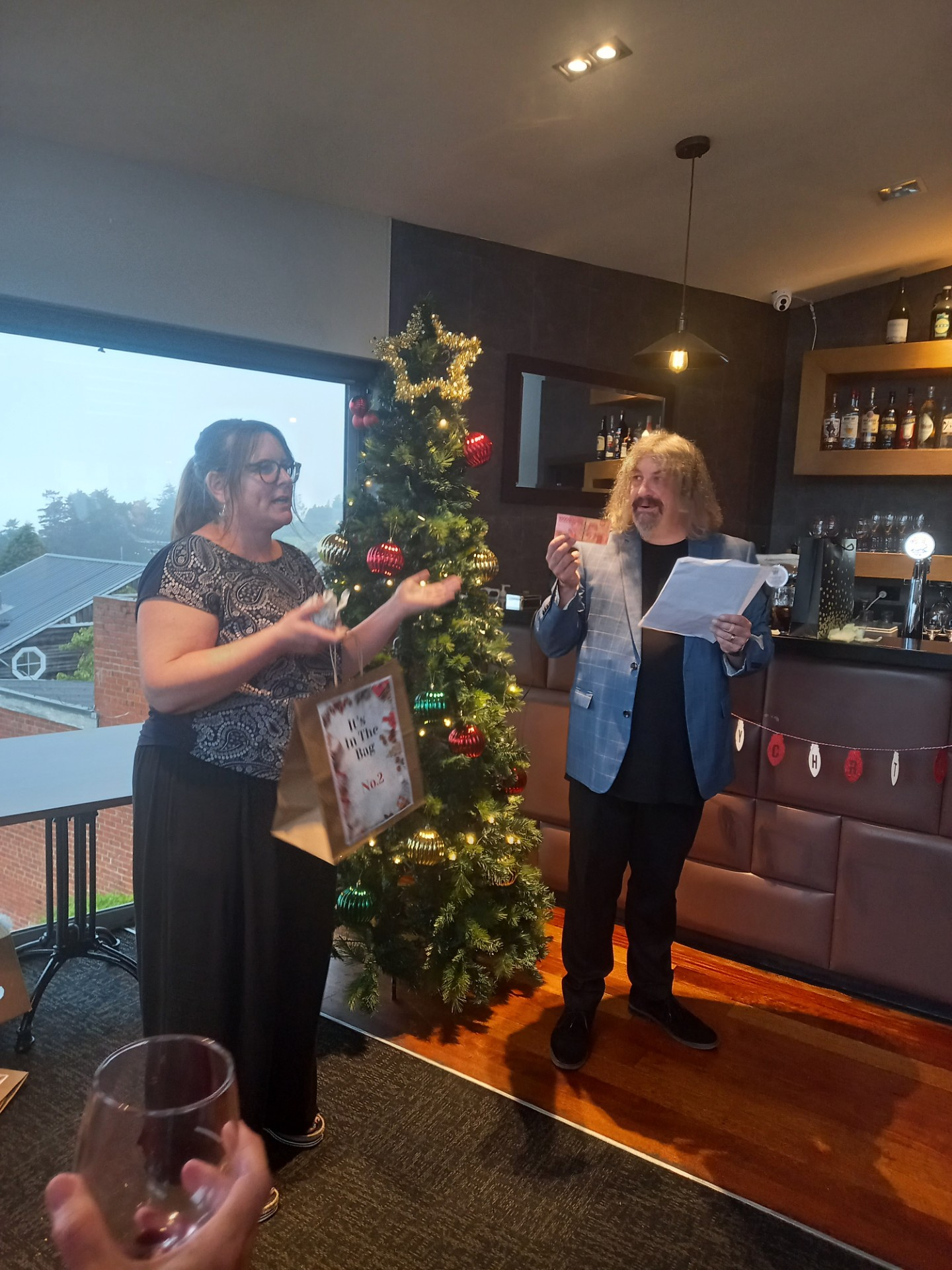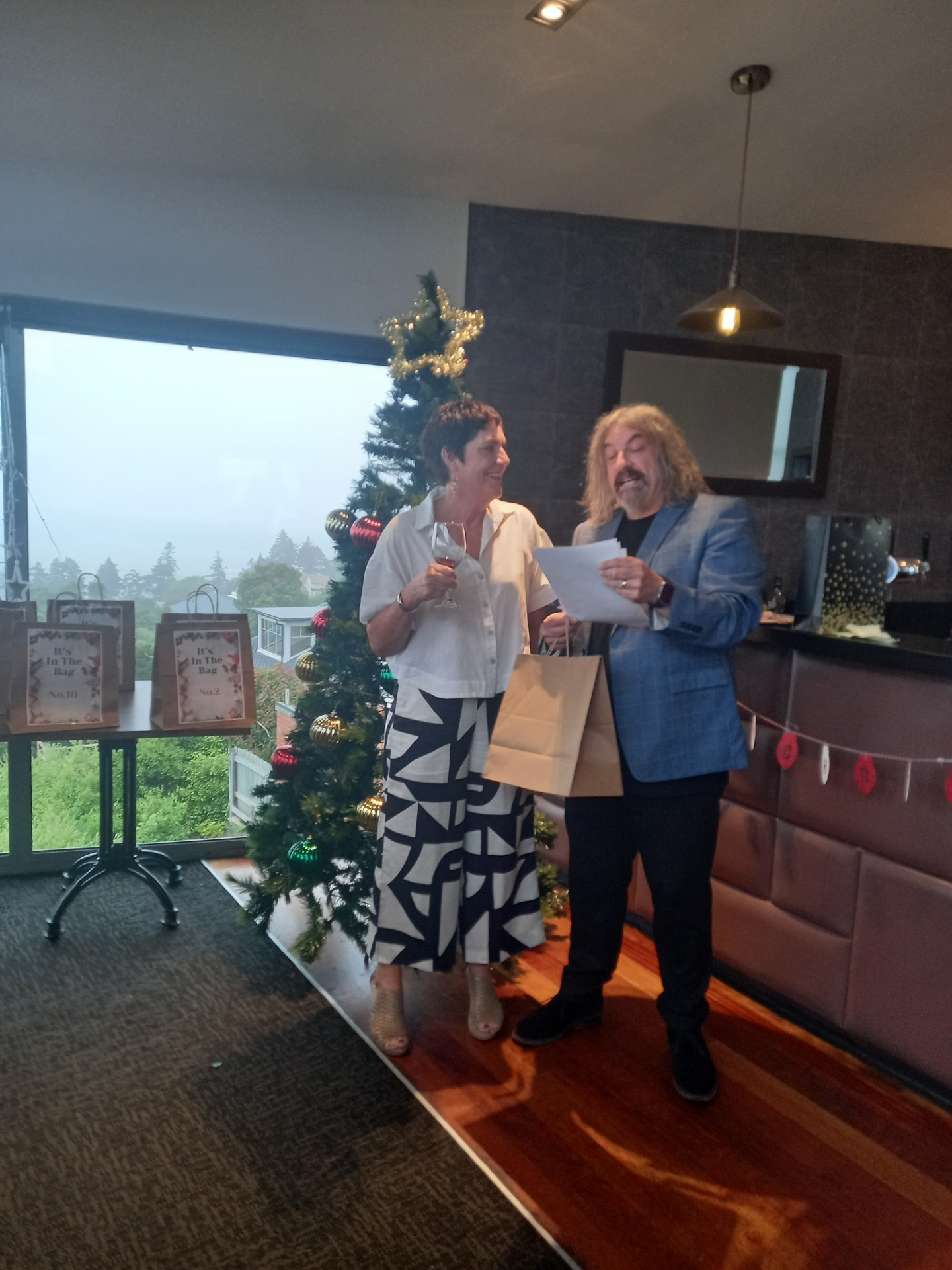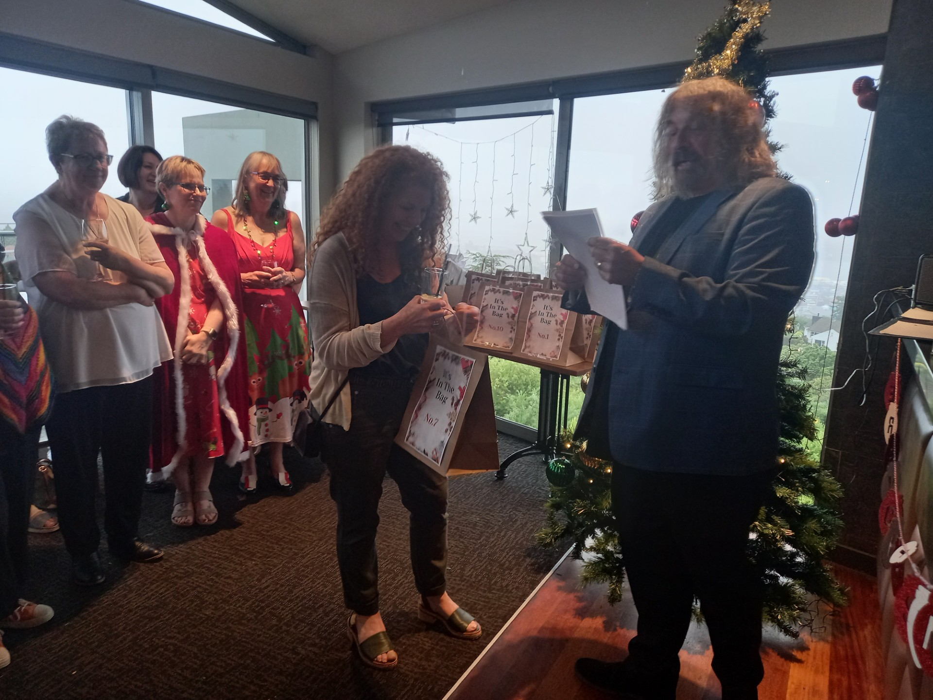 As well as yummy nibbles, drinks and a secret Santa draw, professional MC and entertainer, Jonathan Usher, dropped in to run an "It's in The bag" segment. There were five good prizes that included 'a day off work on your birthday' won by Kaitlyn and Marie - NICE! - and five booby prizes that included a 'Covid Test.' that Christina won - hopefully she doesn't need that prize this holiday season!