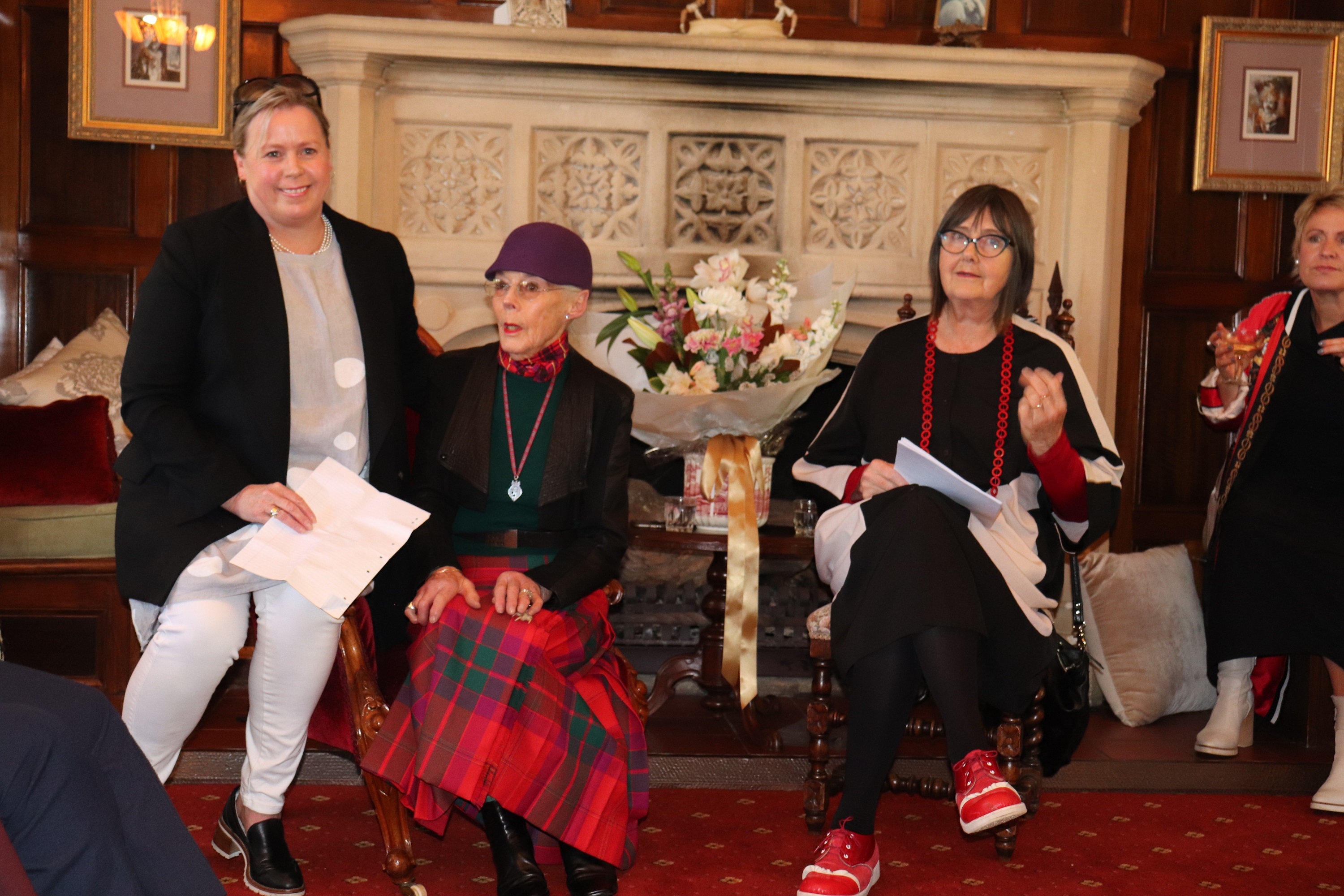 During the "Champagne, Cake & Couture" show, fashion historian Dr Jane Malthus and Mrs Brinsley discussed her collection, which included many international labels, including Dior, Valentino, Jean Paul Gaultier and Maison Margiela, as well as her favourite New Zealand brands and treasures she has found at the Otago Community Hospice retail stores.