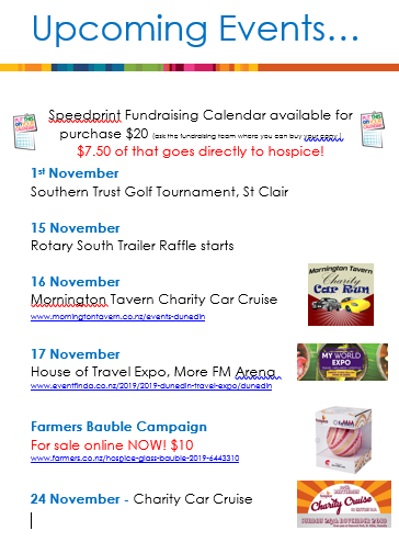 The Funding and Marketing Team are responsible for raising $6,849 a day to meet the funding shortfall to provide Hospice Services over the Otago Region. There are a variety of ways this is done .... and people holding events on our behalf is a significant contributor to our target. November is always a HUGE month for us...see below some of the activities coming up: