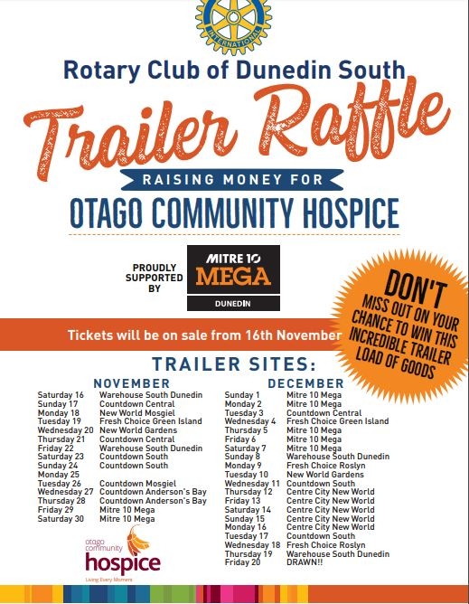 The trailer raffle is eagerly anticipated by the Dunedin community, renowned for its fantastic prizes, with an incredible 16000 tickets on average sold and four massive prizes with a combined value of over $20,000. First prize is a trailer full to the brim with a variety of items for garden, summer and holidays. Second, third and fourth prizes are outdoor furniture, a bbq and a lawnmower.