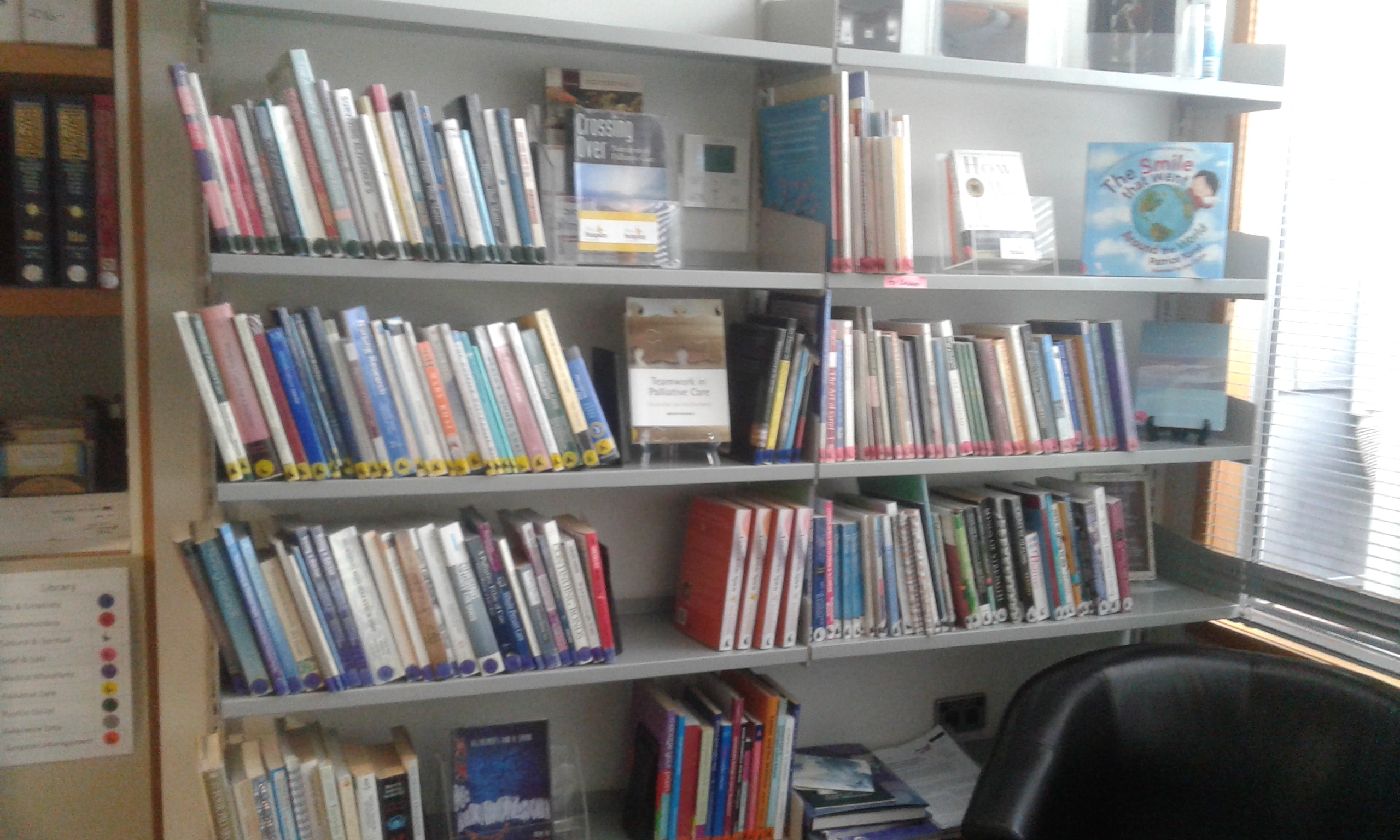 We have a small library, mainly palliative care resources, here at the Hospice in North Road. This is available for use of staff and volunteers during business hours. Please fill out the card in the back of the books and leave in the card file.